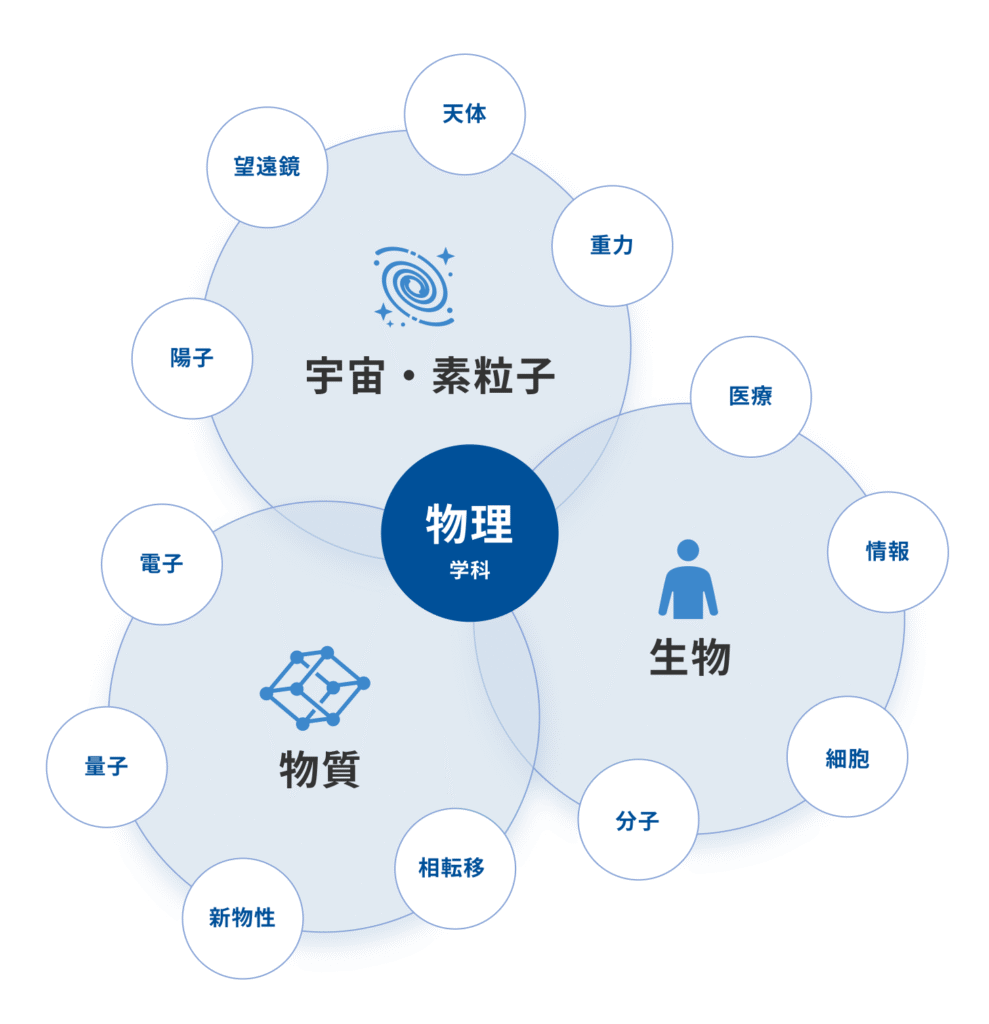 物理学科では素粒子・宇宙物理,物性(凝縮系)物理,生物物理を教育研究活動の3本の柱として,新しい未開拓の分野に挑戦し続けています。なかでも,物理学の視点から生命現象を理解すべく生物物理学分野を主要な柱の1つに据えていることは,本学科の大きな特色の一つです。