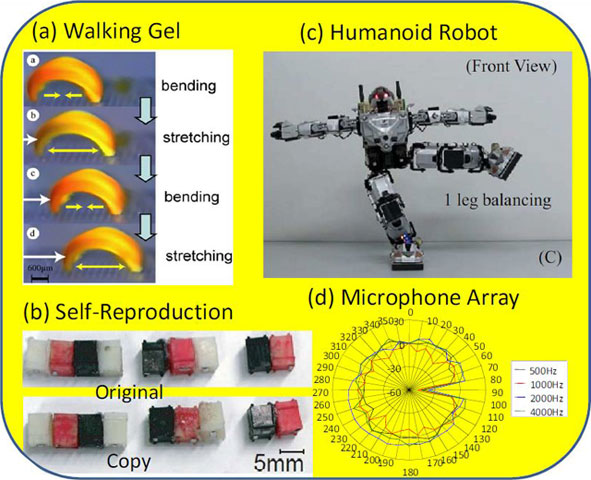 (a) Establishing “Chemical Robotics” to make a soft robot driven by chemical reaction chains. (b) The first trial of self-reproduction of millimeter-scale parts for growing robots. (c) A tactile sensing feet system for humanoid robots can keep balance with a single leg even when external force is applied. (d) Characteristics of a new noise separation algorithm in the time domain utilizing aggregated microphones.