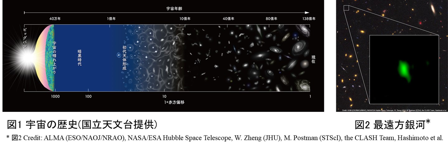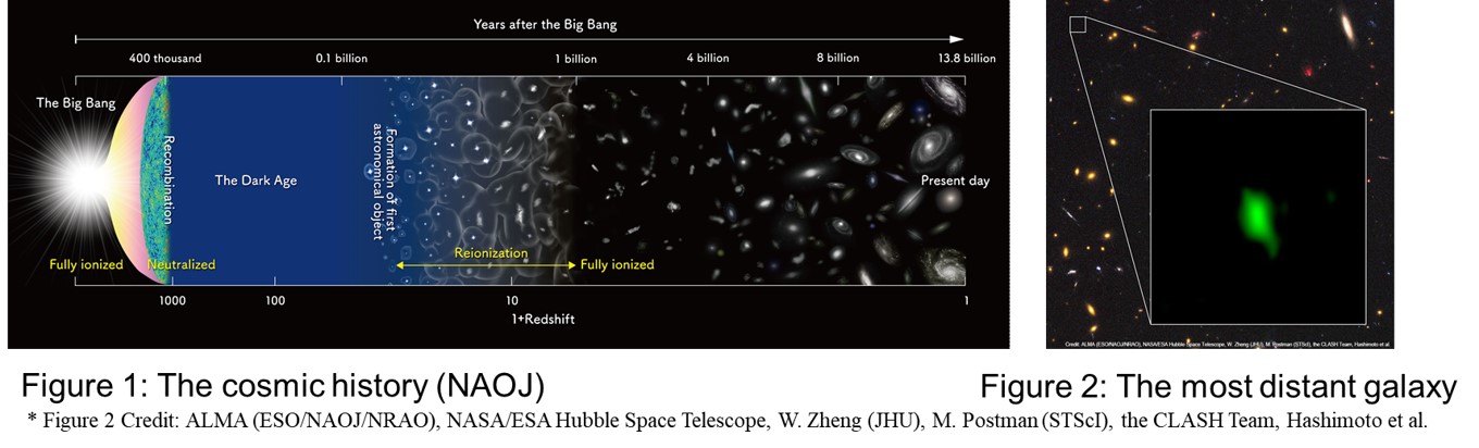 The current cosmic age is estimated at 13.8 billion years (Figure 1). During the first 1 billion years, the first objects and galaxies were expected to be formed theoretically. Observationally, it is difficult to find such objects because they are so faint due to the smallness and great distances. Fortunately, we discovered a galaxy at 13.3 billion light-years by using ALMA (published in Nature, 2018; Figure 2).