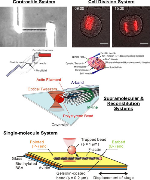 Biological functions are inherently hierarchical. For many years we have been studying the underlying mechanisms of biological functions from the single-molecule level to the level of supramolecular assemblies, focusing on mechanisms which are characteristic of each level of the hierarchy. We have clarified, in particular, the existence of mechanochemical coupling (intramolecular synchronization) between the intramolecular load and enzymatic activity during the movement of single molecular motors such as kinesin and myosin V (VI) on cytoskeletons (microtubules and actin filaments). In our laboratory, we have been focusing on intracellular movement, auto-oscillation of the contractile systems of muscles, and cell division (chromosome segregation) as typical examples of biological movement, trying to make clear whether the forces produced by the molecular motors and cytoskeleton play an important role in the regulation of the elementary processes of motion such as transport, oscillation, and division. That is, we intend to show that the chemo-mechanical feedback loop (CMF loop:) exists throughout the whole hierarchical organization, possessing, however, different mechanisms characteristic of each level. Through this approach, we try to demonstrate that the CMF loop mechanism is a common principle for the regulation of biomotility. We also aim to develop a technique that will allow the use of the cytoskeleton as a “bionanogauge” that will allow, for example, the monitoring of stress imposed on the cytoskeleton. Furthermore, we examine the role of other physical parameters such as heat and temperature.On the single-molecule level, we examine the role of the CMF loop in the mechanisms of the motility and depolymerization/severing of cytoskeletal tracks by measuring rupture force and determining the binding mode of various myosins and regulating proteins with actin, as well as kinesins (such as MCAK) with microtubules. In myofibrils we focus on the molecular mechanism of the auto-oscillation (SPOC), especially in cardiac muscle, coupled with the construction of the theoretical model. Concerning cell division, we concentrate on the balance of tension in the mechanisms of chromosome segregation, perturbing it by applying external forces to the mitotic cells. This approach will allow us to confirm the existence of the CMF loop and make clear its mechanisms on various levels of biological hierarchy.