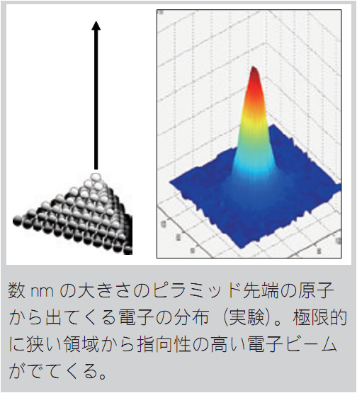 本研究室では、これらの実験技術をつかって、表面上に人為的な構造物を作り、その電子状態、格子振動、等を、トンネル電子、光電子、強電界放出電子、2次電子、オ-ジェ電子を使って、総合的に調べ、今までにない物質の機能を探しております。2006 年から3 年計画の大型研究がスタートしました。この研究テーマは、“1つの原子から電子ビームを取り出す究極的に小さな電子源の実現(図参照)” ですが、この研究、十年以上に渡って、培ってきた我々の独自の実験技術と独自のアイデアに基づいております。
